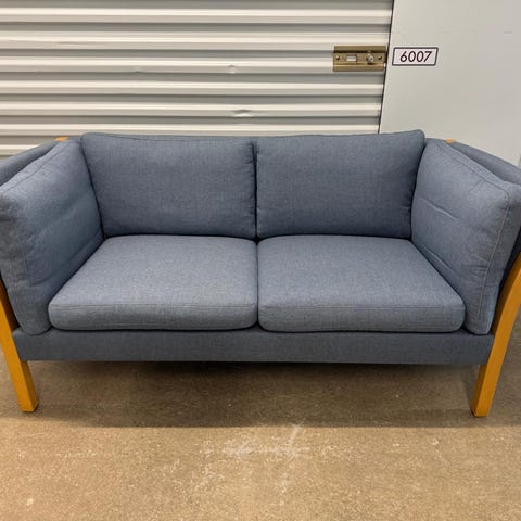 Sofaen har et minimalistisk design med komfortable polstrede rygge og armlæn. Den er beklædt med et blødt, gråt stof. Benene er sorte og slanke hvilket giver et moderne udtryk.,Afhentes i:,Røde Kors Sorø (335),Bemærk at mail, chat og beskeder ikke besvares, og varen skal købes på knappen "Gå til varen"