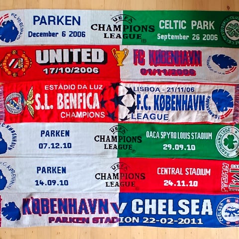 F.C. København halstørklæde i hvid og blå farve med klublogo og navn. Halstørklædet har frynser i enderne og er velegnet til fans og til brug ved sportsbegivenheder.