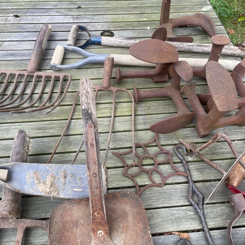 Gamle skovle, spader og hakke. Museumsgenstande, som de er blevet vist og anvendt af "bonderøven". 3 skovle i forskellig form. Ca.100 år gamle med træhåndtag og en spade samt en Hakke. Pris pr. stk. 850 kr. og 2 stk. for 1500 kr. Se foto3256-58K+4726+5348+5887