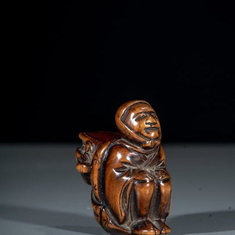 Et boxwood netsuke fra Edo-perioden (tidligt 19. århundrede), der forestiller en sovende sarumawashi med en lille abe på skulderen, der forsøger at stjæle mad fra en bambuspindbeholder; mål 4 x 2,8 x 2,2 cm, i fremragende stand, med originalt certifikat for ægthed fra Mastromauro Japanese art gallery i Milano. Klik på den blå "gå til varen" knap, for at købe eller byde på denne vare. Den samlede pris vil blive vist inden du afgiver dit bud.