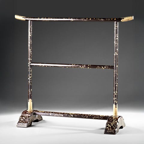 Fremstillet af massivt, oprindeligt keyaki-hårdttræ, fuldstændig færdigbehandlet med en dyb mørkebrun lak med en rødlig undertone og flot patina.