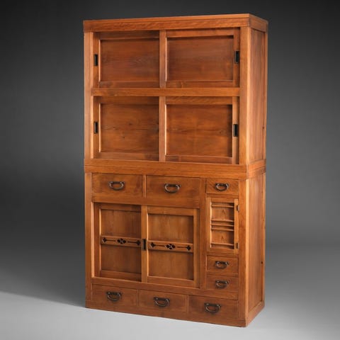 Taishō-periode kiri-træ tansu skab med foldbar gulvskrivebord, fuldstændig restaureret i varmt brunt, 93,1 cm høj, 36,4 cm bred, 45 cm dyb; har kobberlås der gør frontpanelet til en lav bordoverflade, aftageligt panel med polykromt relief af chrysanthemum og Akimine-segl, kobberhanke, to skjulte skuffer der åbner mod modsatte sider, og medfølgende certifikat for ægthed (ingen nøgler). Klik på den blå "gå til varen" knap, for at købe eller byde på denne vare. Den samlede pris vil blive vist inden du afgiver dit bud.