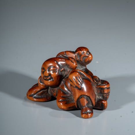En japansk buksbom netsuke, der forestiller en krybende Shishimai-danser. - T...