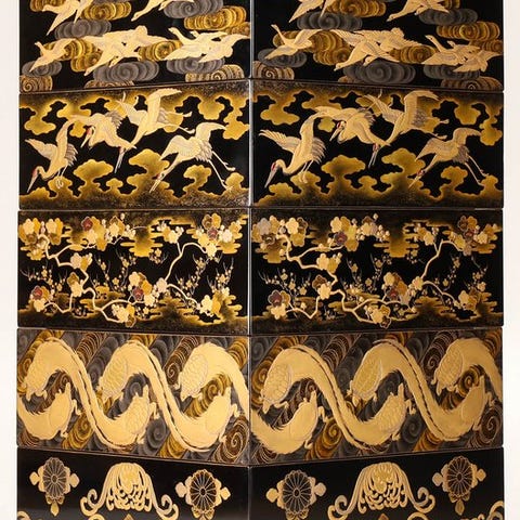En Meiji-periode Sendai-dan SU-skrone med fire skuffer og en side dør der afslører to indvendige skuffer, lavet af træ med jern beslag dekoreret i relief med kraner mellem skyer, 97 cm høj, 85 cm bred og 40,5 cm dyb, i god stand med små alderss tegn og originalt certifikat for ægthed. Klik på den blå "gå til varen" knap, for at købe eller byde på denne vare. Den samlede pris vil blive vist inden du afgiver dit bud.