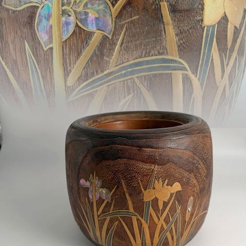 En stor hibachi (火鉢), en traditionel japansk brazier, der engang blev brugt til at opvarme indendørs, i rund form, lavet af lakeret træ med en forgyldt metalindretning.