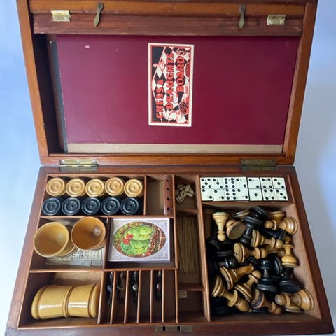 Håndlavet Napoleons slagsjakkssæt i bronze og tin med læderbræt og rød velourbund, oprindelse Frankrig, cirka 1970–1980, stand næsten perfekt. Klik på den blå "gå til varen" knap, for at købe eller byde på denne vare. Den samlede pris vil blive vist inden du afgiver dit bud.