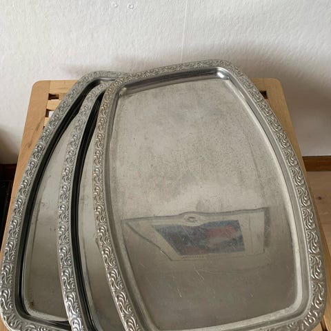 Servicefont med aftageligt, holdbart beholder til gratinering, med en robust metalstøtte i sølvfarvet, høj kvalitet, med relieffdekoration i dynamiske Art Déco-bånd og matchende låg. Fra midten af det 20. århundrede. I fremragende stand.