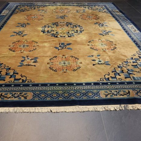 Oprindelse Kina, model china art deco tæppe, uld på bomuld, 202 cm × 140 cm, 21. århundrede, i meget god stand og professionelt rengjort. Klik på den blå "gå til varen" knap, for at købe eller byde på denne vare. Den samlede pris vil blive vist inden du afgiver dit bud.