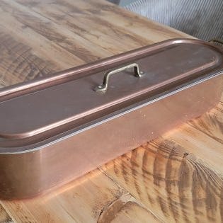 Dette er et stykke af ægte historisk og professionelt køkkenudstyr. Det er en Pesciera (Poissonnière) i massivt kobber, komplet med alle dens originale elementer: kroppen, låget med træhåndtag og det indvendige perforerede kurv.