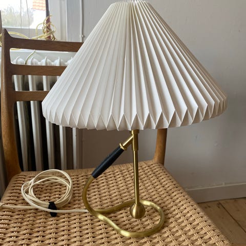 Skærmene er en original Le Klint model 2/23 i hvid plissé og måler Ø29 cm. Lampen har en elegant messing-finish og en unik buet fod.