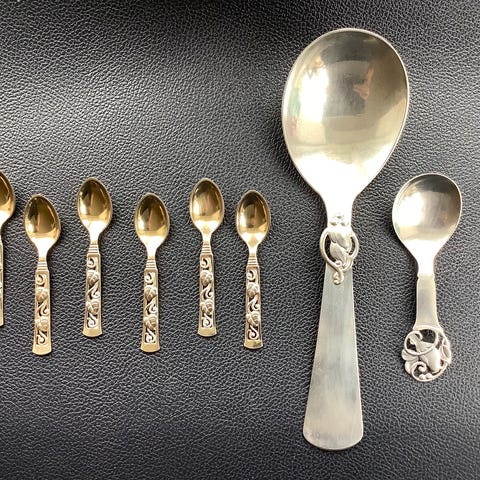 Kartoffel- og sovseske, 3-tårnet sølv og rustfritstål, 1947 år gl., Sælger dette smukke 3-tårnede sølvsæt bestående af kartoffel- og soveske fra 1947 og med drueklaser på sølvskaftet og rustfrit stål i skeen. Stemplet CM og JS for guardein Jens Sigsgaard.