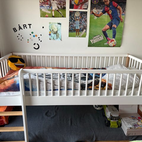 Grå børneseng inkl. madras og stige