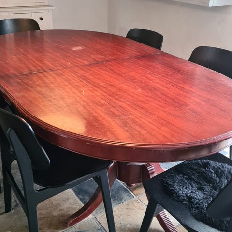 Stort bredt lyst lakeret spisebord med tillægsplade skjult under bordet.