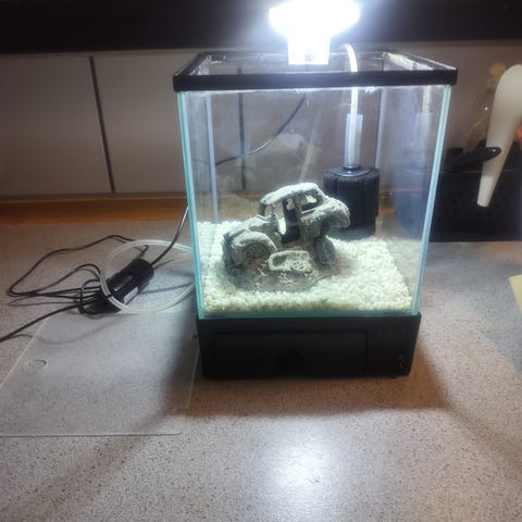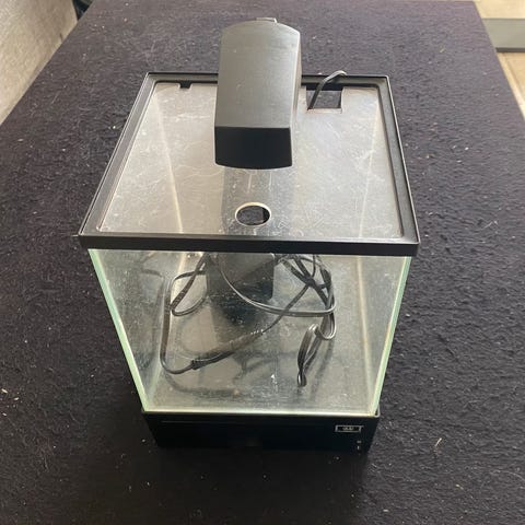 Lille åben akvarie med lys og filter. Bundlag, termometer og rejeskjul medfølger.