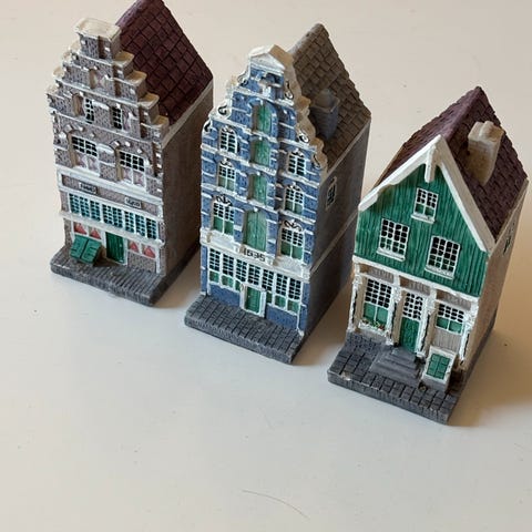 3 dekorative huse i træ. Højde ca. 18cm. Flotte. Samlet