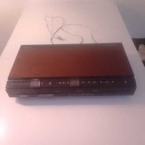 Radio fra Bang & Olufsen. Model beocenter 1400. Radioen har også en kassettebånd afspiller. Den kan tænde og der er lys hvor der skal være lys. Der er nogle mørke pletter på træet og lidt slidtage metallet. Volum knappen dur ikke.