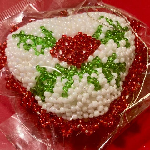 Sødt retro perlepynt 💙 Her et hjerte med motiv af en sneklædt kirke. Fin stand.