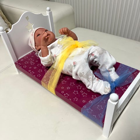Ny Baby Born Mini Mommy dukkedyne og pudesæt med tilbehør inklusive regnslag, insektnet. Passer til dukker op til 50 cm. Sættet er designet til dukker og har en lyserød og lilla farve med mønster.