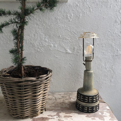 Fin bordlampe med 6 små opbevaringsrum til småting så som blyanter mm. Lampen er i blå grå farve og sort ledning.