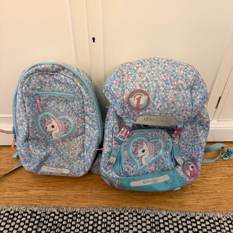 2 tasker der er lyseblå med et motiv af en unicorn på forsiden. Der er flere rum med lynlåse og justerbare stropper for komfort. Den ene Rygsæk er stor med dimensioner på 45x40 cm, passnde for skolebrug eller udflugter.Den lille kan brugea aom tur-taske. Materialet har et stjerne- eller skyprint, som giver den et drømmeagtigt udseende.