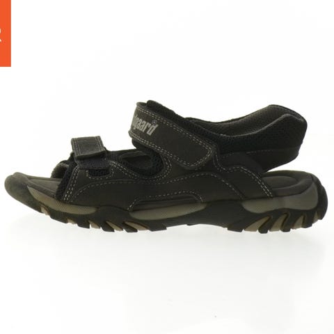 En enkelt par bundgaard børnesandaler i læder, størrelse 29. Sandalerne har en mørk farve og er designet med flere remme for komfort og støtte. De har en velcrolukning, som gør dem nemme at tage på og af. Bagsiden af sandalerne har en bundgaard logo. Den sål er lavet af gummi, og indersiden ser ud til at være lavet af læder for øget komfort.