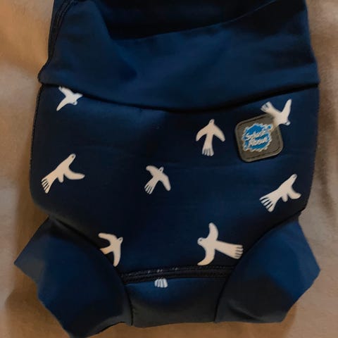 Badebukser til babyer med et blomsterprint. Bukserne er røde med hvide blomster og har lyserøde kanter. De er designet med en høj talje og er lavet af et materiale, der sikrer en god pasform og komfort under svømning.