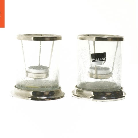 Disse lysestager fra Parlane er fremstillet af glas og metal med en størrelse på Ø 8x11 cm. De er designet til at holde fyrfadslys, som er placeret i en lille rund metalholder inde i glasset. Det ydre glas har en karakteristisk krakkeleret overflade, og bunden samt toppen af lysestagerne er fremstillet af blankt metal.