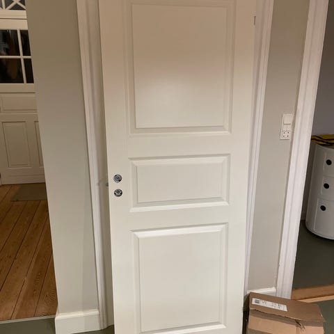 Indvendig dør med glat hvid overflade, metalgreb og nøglehul.