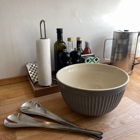 Salat skål, Meget flot Salatskål i træ med tilhørende bestik , købt i Illum Bolighus. Dia 30 cm , højde 13 cm. Kun brugt til pynt.