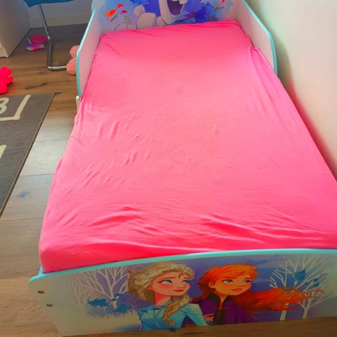 Super flot juniorseng fra Disney Frost. Fremstår som ny. Madras følger med, Købt fra ny til Ca 2000kr og brugt minimalt. Sælges pga flytning