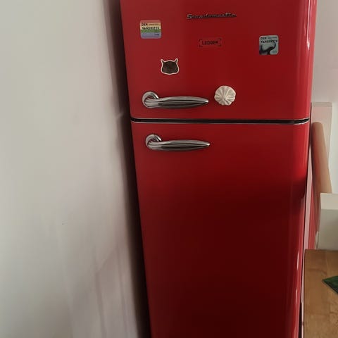 Der er stadig plastik på siderne fra da vi købte det. Det fungerer uden problemer, og lugter ikke indeni. Det kan hentes i stueetagen på Nørrebro.