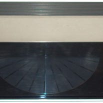 Bang & Olufsen pladespiller med minimalistisk design og sort finish. Enheden har en drejeskive til afspilning af vinylplader.