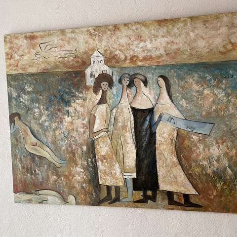 maleri fra 1999. Maleriet har abstrakte motiver med mørke og lyse farger, og er indrammet med en enkel ramme.