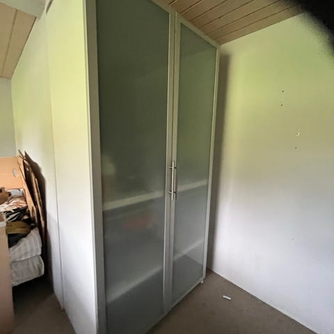 Ikea garderobe / closet in good condition, with accessories and glassvik door in gray color. Perfect for room decoration with neutral design. With door, deep measurement is around 65 cm. without door around 60 cm total.
