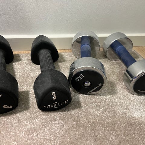 Sæt bestående af forskellige håndvægte i flere størrelser og farver, kettlebells, og træningsudstyr til styrketræning.