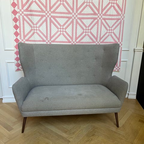 Grå to-mands sofa. Sofaen er brugt, men fejler ellers ikke noget. Hentes fra 1. sal.
