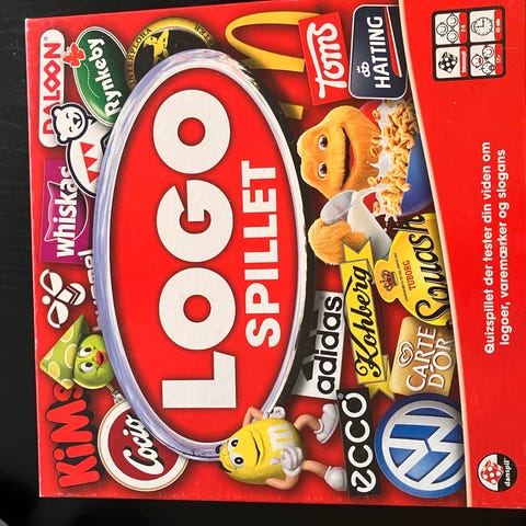 Logo Spillet brætspil med fokus på viden om logoer, varemærker og slogans. Spillet indeholder et farverigt spille bræt og kort med forskellige logoer til quiz og konkurrence.