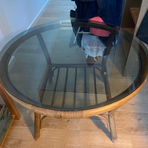 Sofabord pæn stand dog brugt. Sort oval træramme som holder glas pladen.