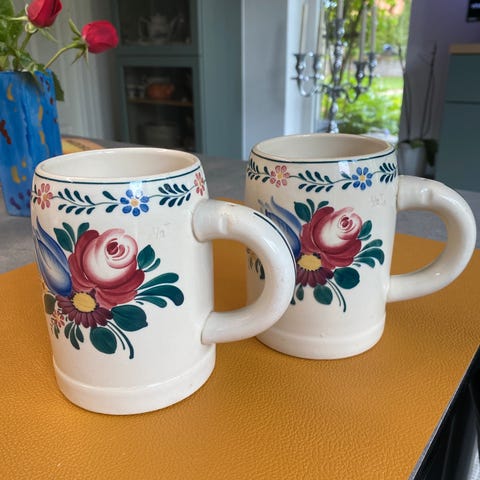 1 krus h 9cm ø 8cm, underkop ø 15,5cm, kagetall ø 20cm, dyb tall. ø 22cm, alt i fin stand, samlet pris