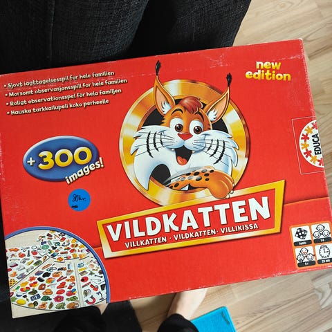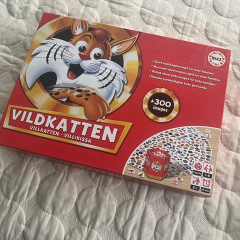 Vildkatten Mini Sjans brætspil med 70 brikker. Spillet er designet til børn og indeholder farverige illustrationer af dyr og objekter. Det kan bruges til læring og underholdning for små børn.