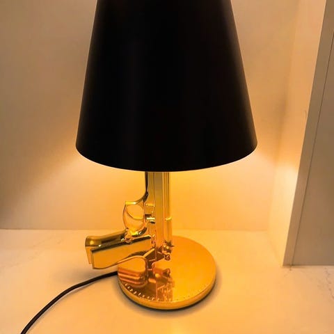 Sælger denne flotte og ikonisk 18k lakeret guld Gun Bedside bordlampe fra det italienske luksus mærke, FLOS, designet af Philippe Starck i 2005.