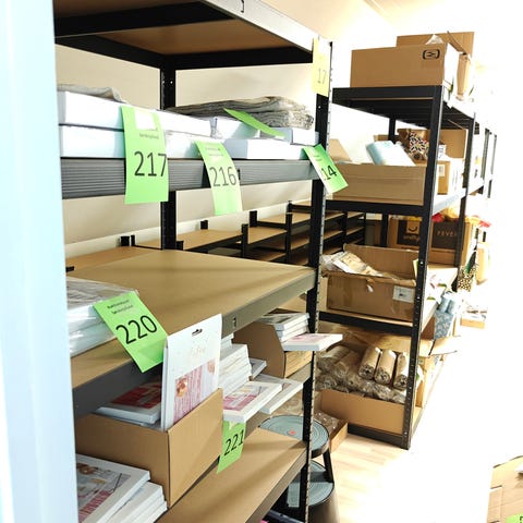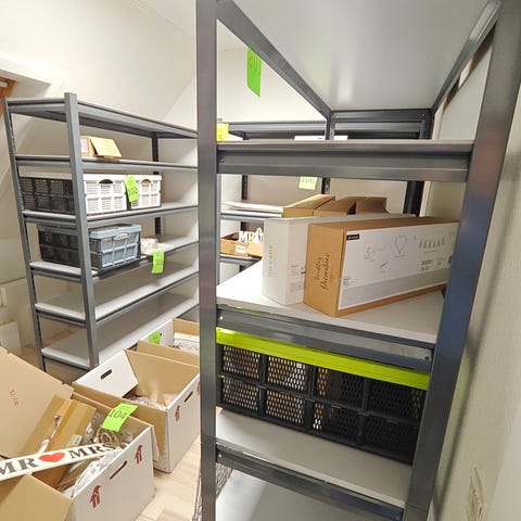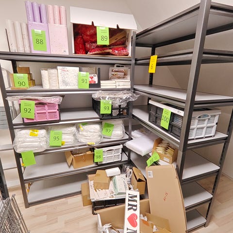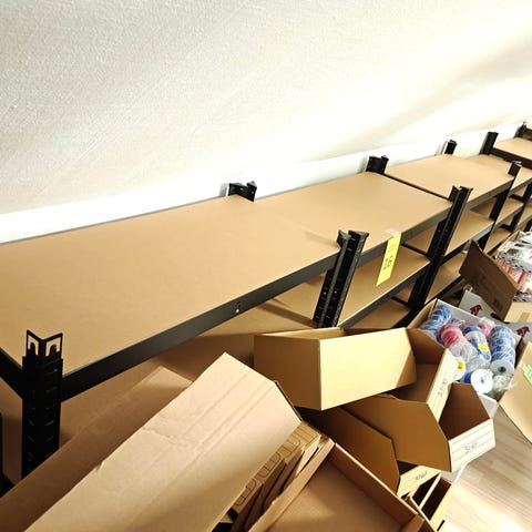Reoler, 4 stk. Reoler med MDF hylder. Reolerne er 2 delt og måler i alt 160 b x 59 d x 180 høj. Der er i gennemsnit ca 6 hylder og 2 gavle til hver. Bemærk kan to deles. Uden indhold. I pæn stand. Fra lukket webshop.