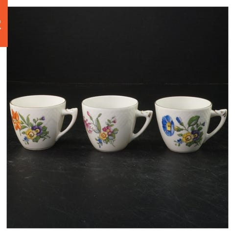 Saksisk Blomst kaffekop, dekoreret med forskellige blomster på creme bund, og med guldkant.