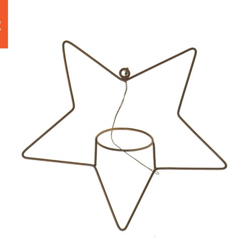 Dette er en dekorativ lysestage, designet i form af en stjerne med en diameter på 21 cm. Lysestagen er lavet af metal og har en tynd ledning til ophængning. Den er beregnet til at holde et lille lys centralt placeret, hvilket skaber en stilfuld og enkel dekoration, der kan hænges op i hjemmet. Den er særligt velegnet til juledekoration, men kan bruges året rundt for et moderne udtryk.