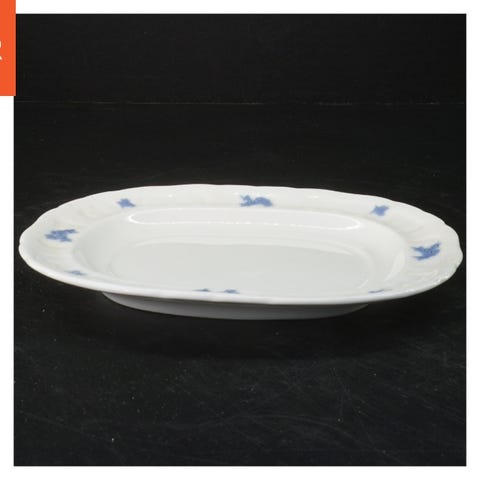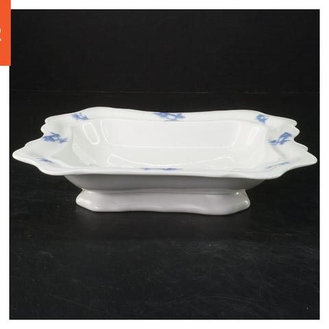 Et elegant serveringsfad/skål lavet af porcelæn med mål 23x20x4 cm. Fadet har en hvid overflade med dekorationer af blå blomster langs kanterne. Det rummer rigelig plads til servering af mad og har en løftet base, der giver stabilitet.