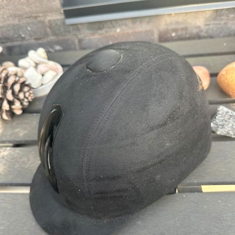 Sort rytterhjelm med sølvfarvede detaljer. Hjelmen har ventilation og justerbar rem for bedre pasform. Den er velegnet til ryttere, da den yder beskyttelse under ridning.