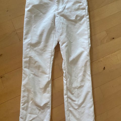 Et par grå habit bukser med et diskret stribet mønster. Bukserne har to knapper foran ved lukningen og en knap bagpå ved lommelukningen. Der er lommer både foran og bagpå. Bukserne er designet til formelt eller semi-formelt brug.