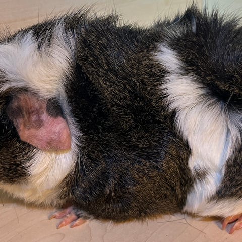 Hun er California. Jeg har set hende an, men hun trives ikke i hun flokken og virker stresset. Derfor skal hun ikke indgå i avlen, men skal i stedet være kælegris. Umiddelbart er hun ikke oplagt som kæledyr til mindre børn pt. da hun nemt bliver stresset. Så et hjem med ro, tålmodighed og kærlighed er det hun søger.