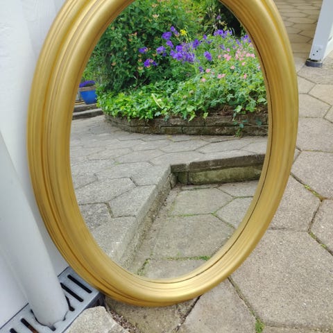 Et par dekorative spejlrammer med en elegant, detaljeret guld-look design. Rammen har et integreret krog i bunden, hvilket gør den ideel til ophængning af lette genstande. Begge spejle har en rektangulær form med prydende kantdetaljer, der giver dem en antik stil. Bagsiden er dækket med en kartonplade, der holder spejlet på plads. Størrelsen på hvert spejl er 28,5x16,5 cm.