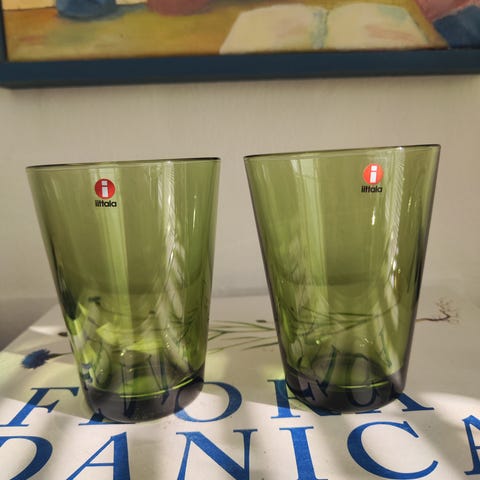 Disse er et sæt af to blå Kartio skåle designet af Kaj Franck for Iittala. De er lavet af glas og har en konisk form. Den medfølgende emballage viser at de er en del af Kartio serien af Iittala, som er kendt for sit enkle og tidløse design.